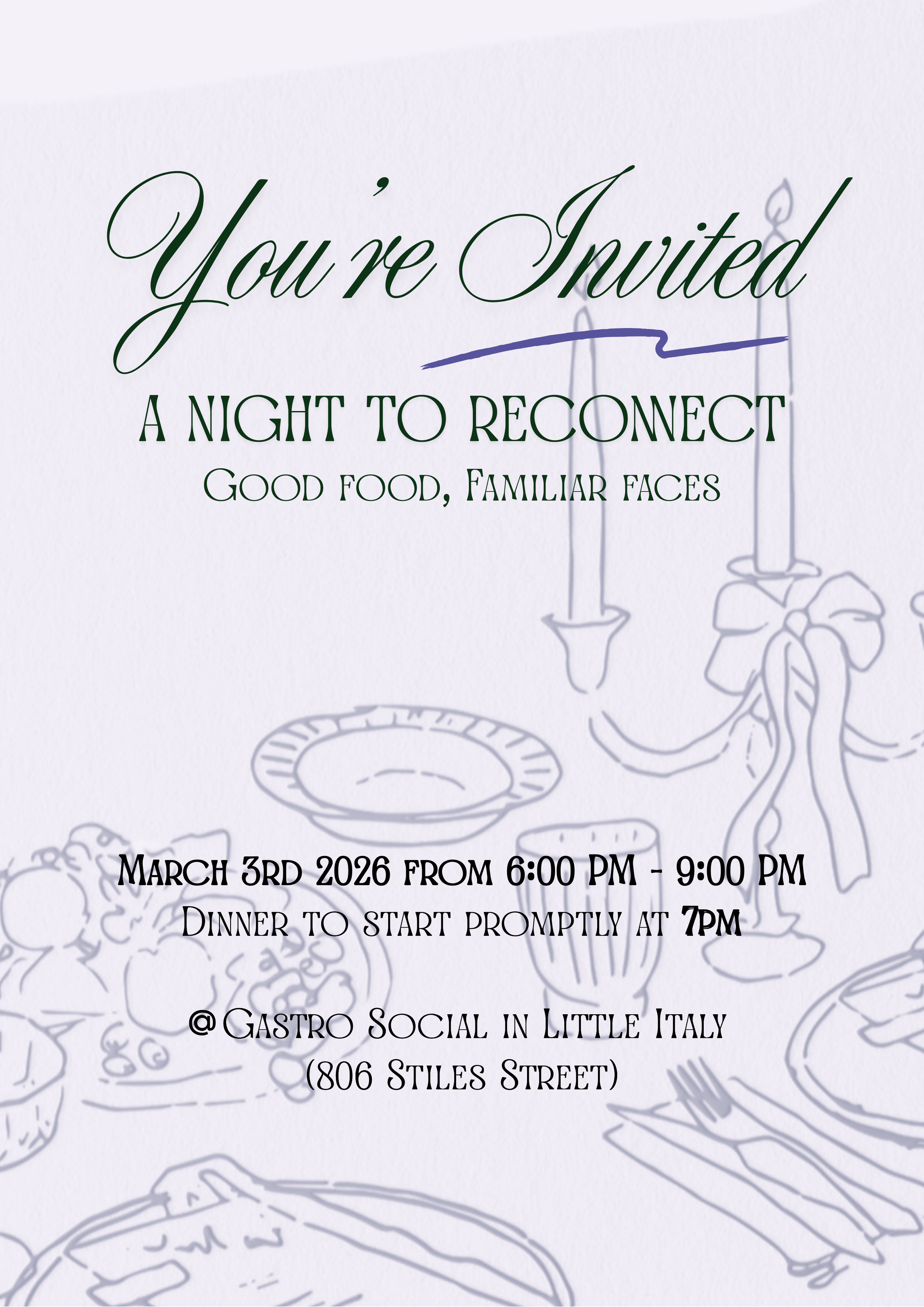 We’re excited to invite you to “A Night to Reconnect”, a private dinner gathering for a select group of our clients. This intimate evening is all about great food, meaningful conversation, and celebrating our community.
